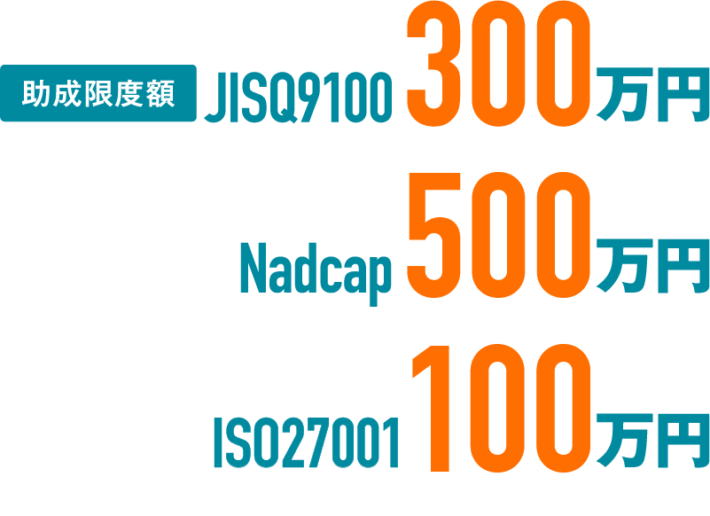 JIS Q 9100認証:300万円以内、Nadcap認証:500万円以内、ISO27001認証:100万円以内
